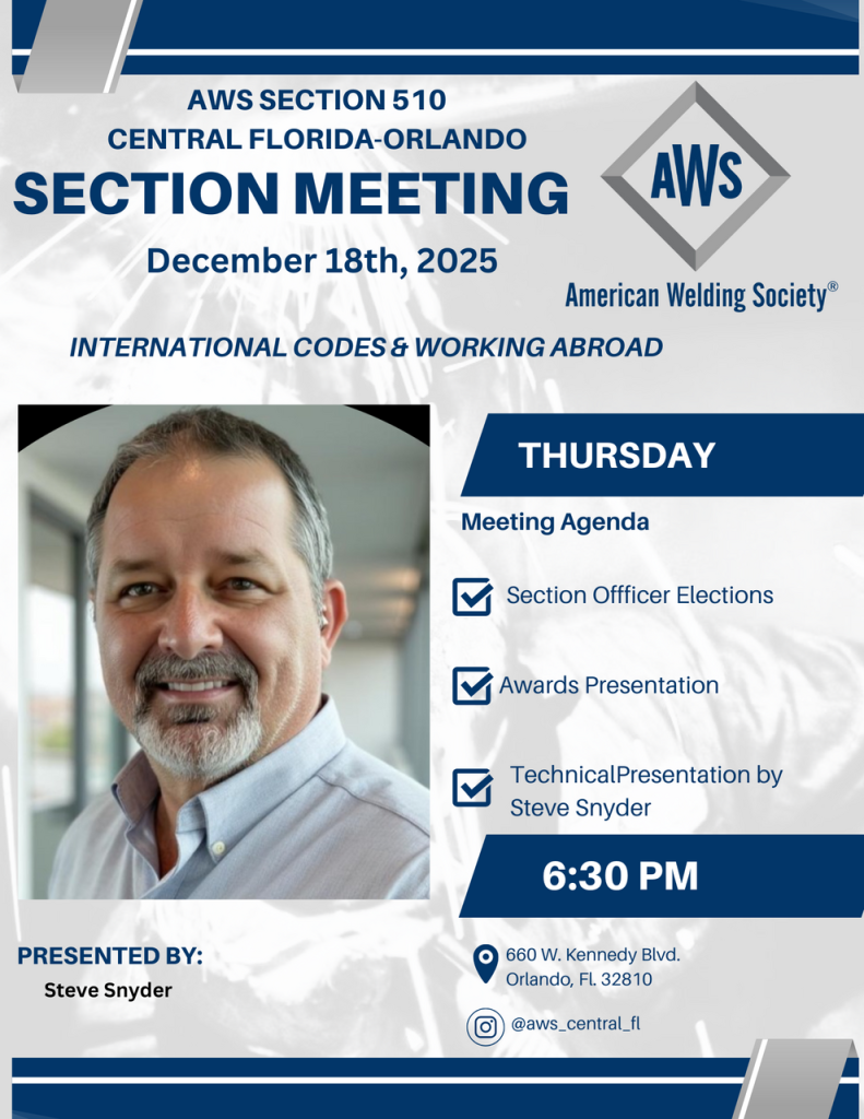 Join us for our final AWS Section meeting of 2025! This month’s gathering will include the election of new section officers, and we encourage anyone interested in getting involved to volunteer. We are currently seeking candidates for Second Vice Chair, Secretary, and Social Media Chair. If you’d like to take a more active role in supporting the welding community, this is a great opportunity to step into leadership.