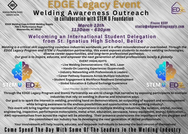 Along with great connections, there will be opportunities to demo different welding processes, including the new EDGE laser welding trailer. While also bringing in industry leaders and professionals from multiple welding sectors. Individuals looking at getting into welding or are currently welding will have the chance to talk with these industry leaders about what Welding looks like in that specific field! Bringing more awareness to the potential and diversity that Welding offers! This event will provide helpful information, impactful knowledge for foundational skills and advancing technology in the industry—all designed to spark interest and create lasting impact for the next generation in Welding!