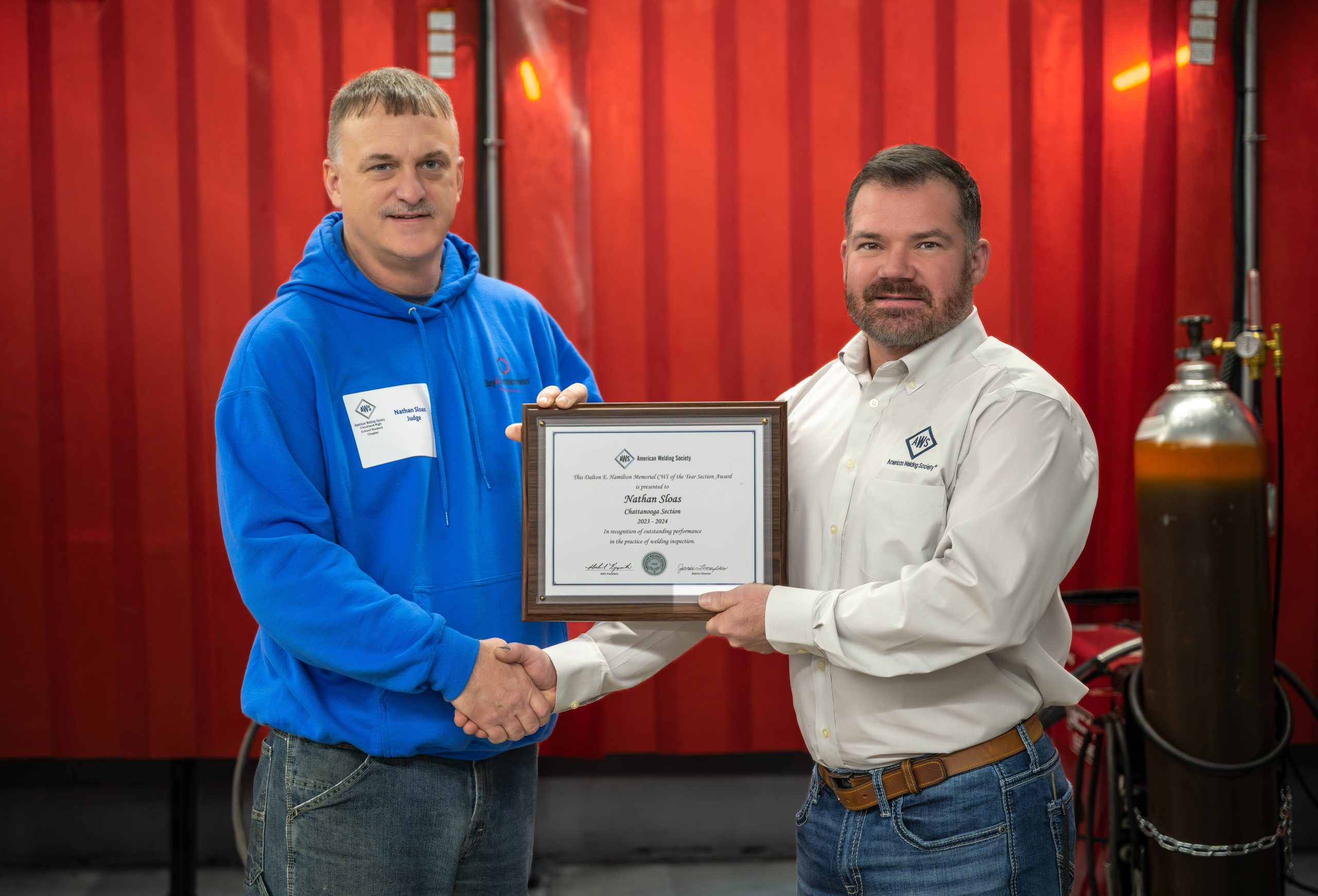 Event Summary: AWS President Dr. Joshua Burgess (TVA Sr. Program Manager – Welding) presented Nathan Sloas (D&Z Quality Manager) with the Dalton E. Hamilton Memorial CWI of the Year Section Award.