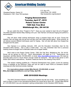 Do you watch the show “Forged in Fire”? Have you ever wanted to learn the art of forging? The AWS Cleveland Section May meeting is for you! Dan Harrison will discuss forging and perform a demonstration.