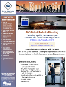 Learn about all of the latest welding news in Detroit, Michigan, by subscribing to the AWS Detroit Section online bulletin. Ask us about our great bulletin advertising opportunities.