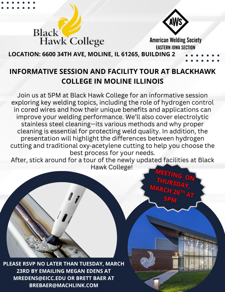 Join us at 5PM on Thursday, March 26 at Black Hawk College for an informative session exploring key welding topics, including the role of hydrogen control in cored wires and how their unique benefits and applications can improve your welding performance.