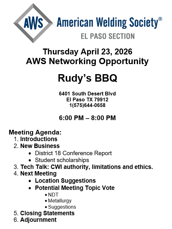 By zmederosApril 20, 2026Category: Uncategorized Join us on Thursday, April 23 from 6-8PM MTN to discuss new business, District 18 conference proceedings and a Tech Talk.The Tech Talk will be a discussion of CWI authority/limitations and ethics. 📍Location: Rudy’s BBQ at 6401 South Desert Blvd, El Paso, TX 79932