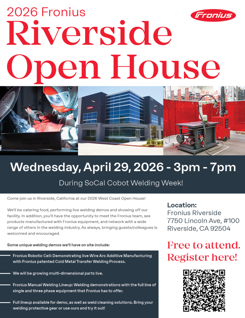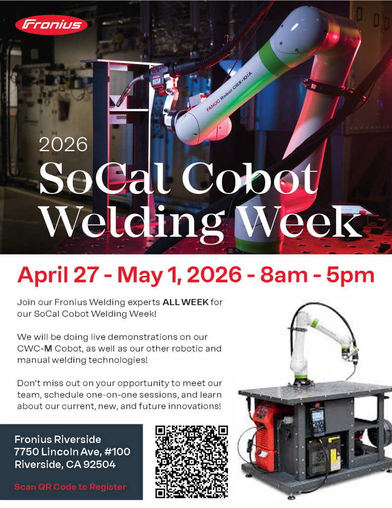 By zmederosApril 14, 2026Category: Uncategorized Come join the LA/IE Section Leadership Team at the Fronius SoCal Cobot Welding Week and Open House on Wednesday, April 29th in Riverside, CA.The event will emphasize welding robotics from 8:00 AM – 5:00 PM and a facility open house with networking and food from 3:00 PM till 7:00 PM.Attendance is free but we do request registration with Fronius through the link in the attached flyers.➡️RSVP HERE📍Location: Fronius Riverside at 7750 Lincoln Ave, #100 Riverside, CA 92504