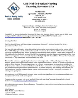 Please remember to connect with us via Facebook! Find us by searching “American Welding Society Mobile Section” or at www.facebook.com/AwsMobileSection.