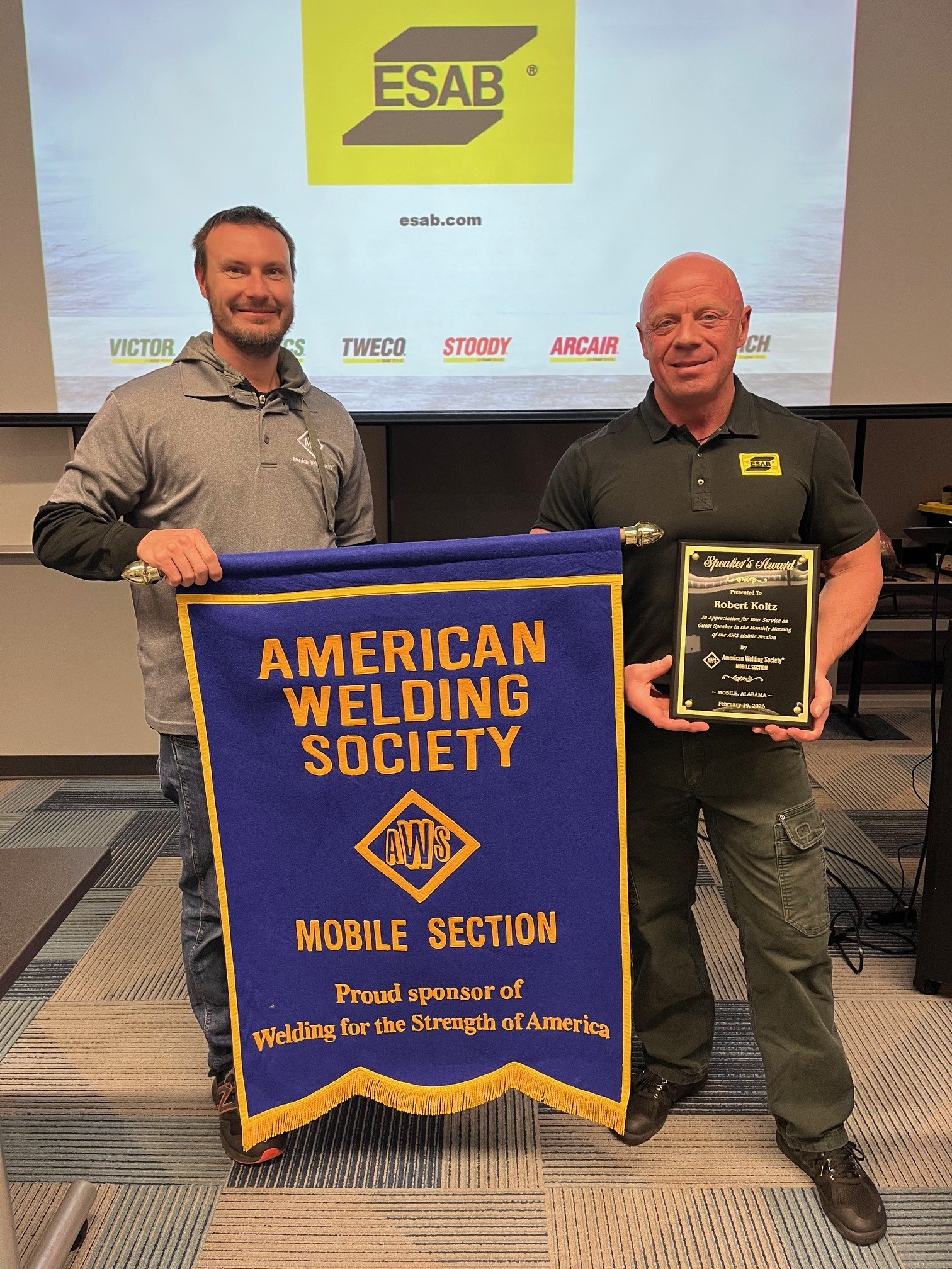 Event Summary: The Mobile Section wants to thank AIDT Maritime Training Center in Mobile, AL for hosting the sections February monthly meeting and Esab for sponsoring the meeting. Robert Koltz of Esab was the guest speaker for the night and presented on Submerged Arc Welding. There were 43 members and guests that attended.