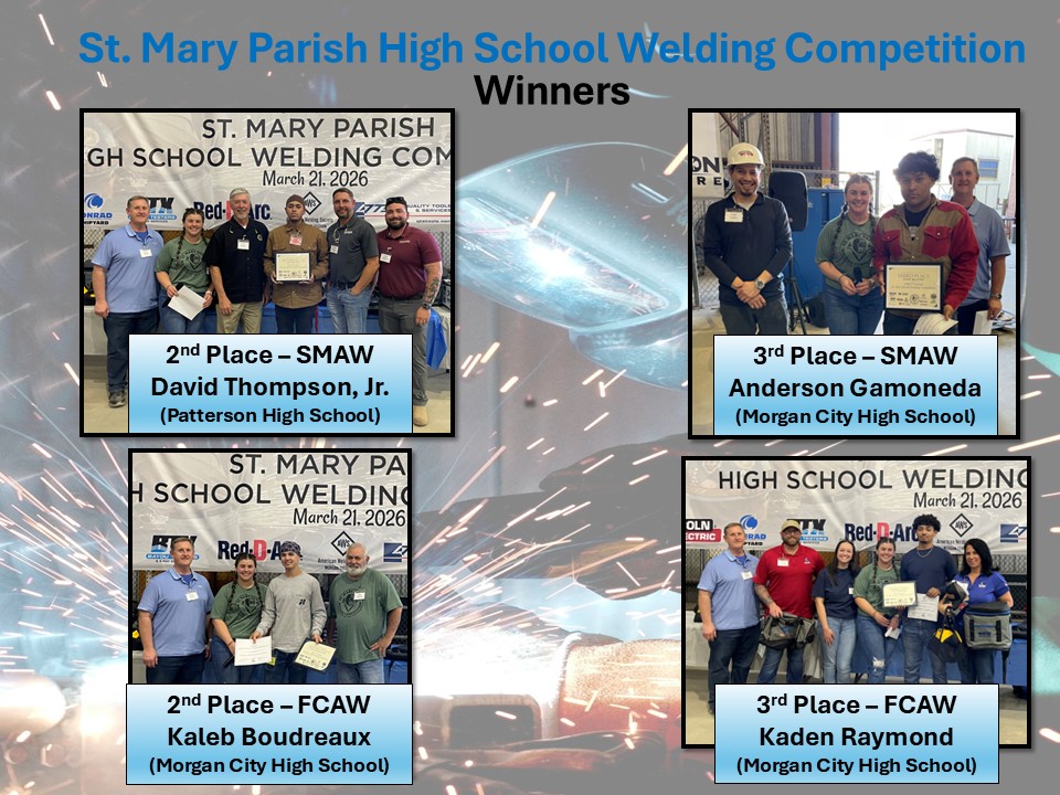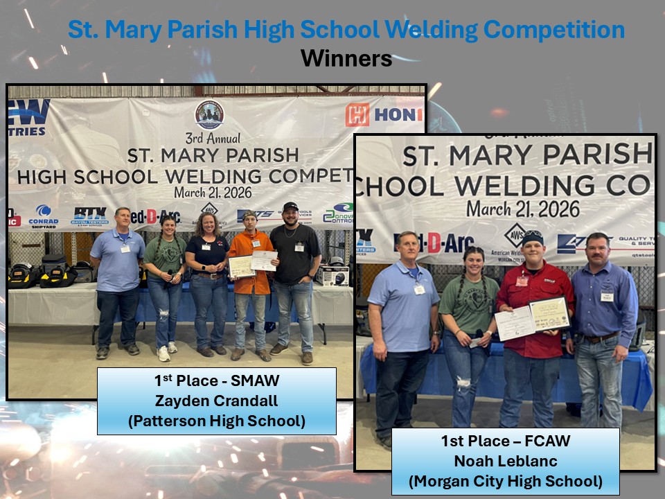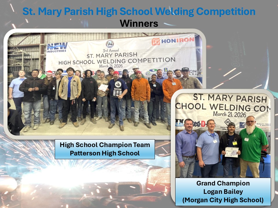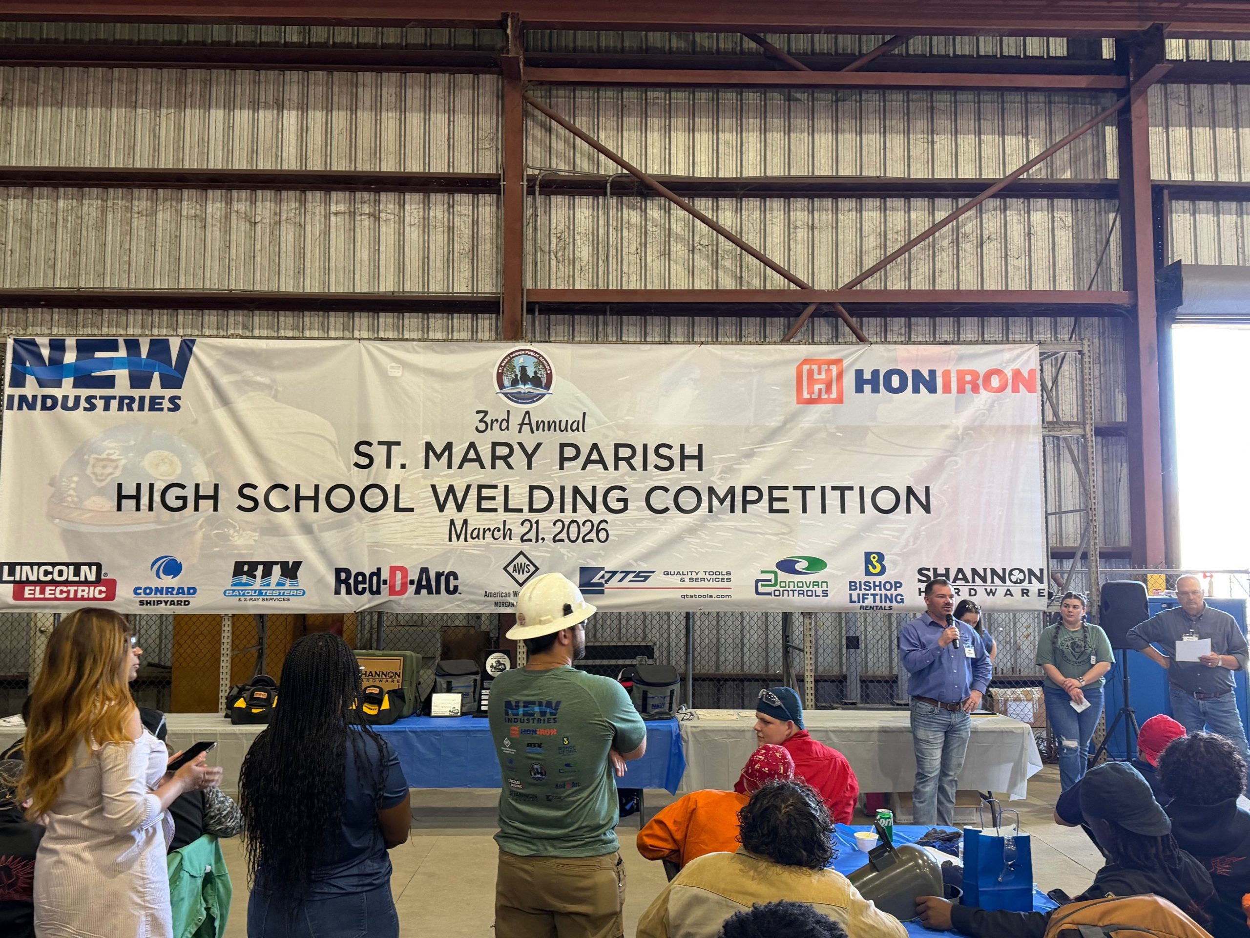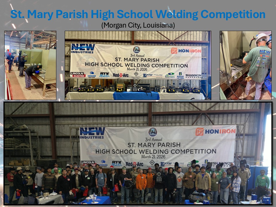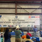 Event Summary: The event was the 3rd annual St. Mary Parish High School Welding Competition that has been organized and hosted by New Industries Inc. / Honiron. The competition was enthusiastically supported and co-sponsored by the following: St. Mary Parish School District, AWS Morgan City Section, Lincoln Electric, Conrad Shipyard, Bayou Testers and X-Ray Services, Red-D-Arc, Quality Tools and Services, Donovan Controls, Bishop Lifting Rentals, Shannon Hardware.