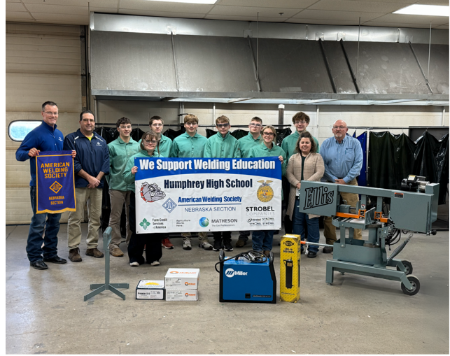 Event Summary: The American Welding Society Nebraska Section 81 and The Columbus Nebraska Farm Credit Services Branch donated $5000.00 dollars each totaling $10,000.00 dollars to donate equipment to the Humphrey Public Schools Welding program. Each year the Nebraska Section selects a welding program in their area to help purchase equipment to update their welding program or equipment to teach additional skills. Strobel Energy donated an electrode oven, and the funds were used to purchase a MillerMultimatic 220 with cart, Ellis Bandsaw, and weld wire. The instructor Robyn Graham said ” We are very grateful for the support and the new equipment. Greg Schroeter, director of QA/QC for Strobel Energy Group, of Clarks, said ” they are happy to help who, hopefully, will enter the workforce as welders”. In the words of Luke, Greg’s son, said “Mrs. Graham she was one heck of a welding teacher, and I still know thanks to her.” Representatives from the AWS, NECC, Matheson Gas, and Humphrey High discuss the welding classes offered, welding processes and skills being taught and how theses fit in the industry standards and preparing students for welding college, and the industry.