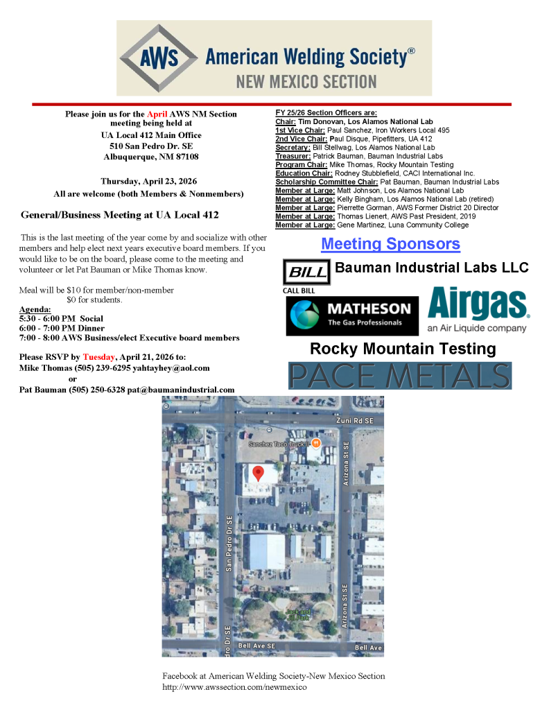 By zmederosApril 9, 2026Category: Uncategorized Hello New Mexico AWS members,Please join us on Thursday, April 23 at 5:30PM MT for a general meeting to socialize and elect next years Executive Board!RSVP by April 21, 2026 to Mike Thomas (505) 239-6295 yahtayhey@aol.com or Pat Bauman (505) 250-6328 pat@baumanindustrial.comLocation: UA Local at 412 Main Office 510 San Pedro Dr. SE Albuquerque, NM 87108