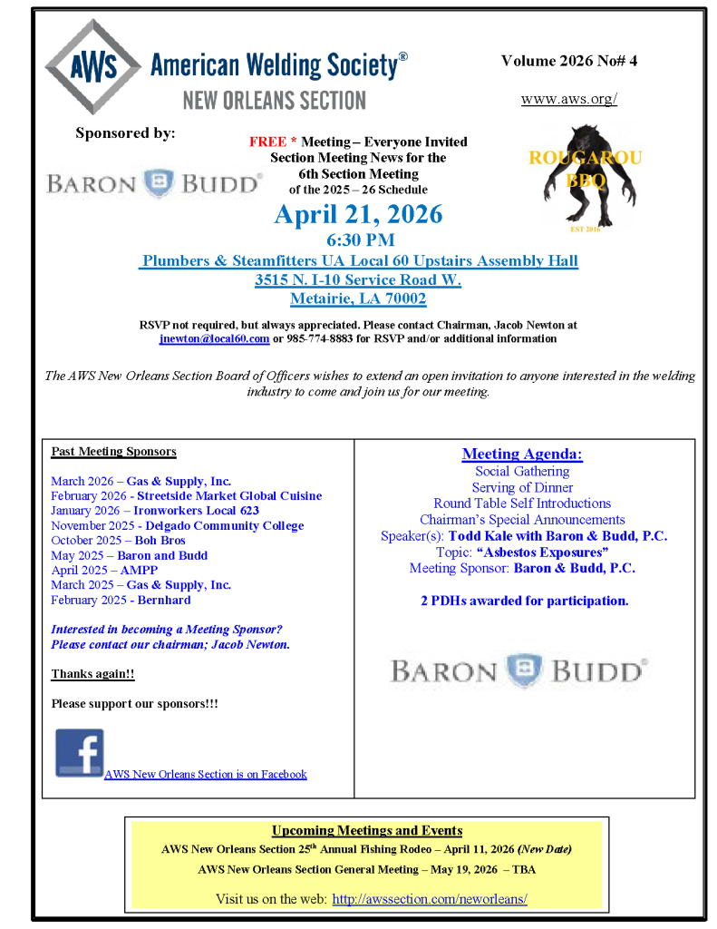 AWS New Orleans Section will be hosting its May General Meeting on April 21, 2026 at 6:30PM.