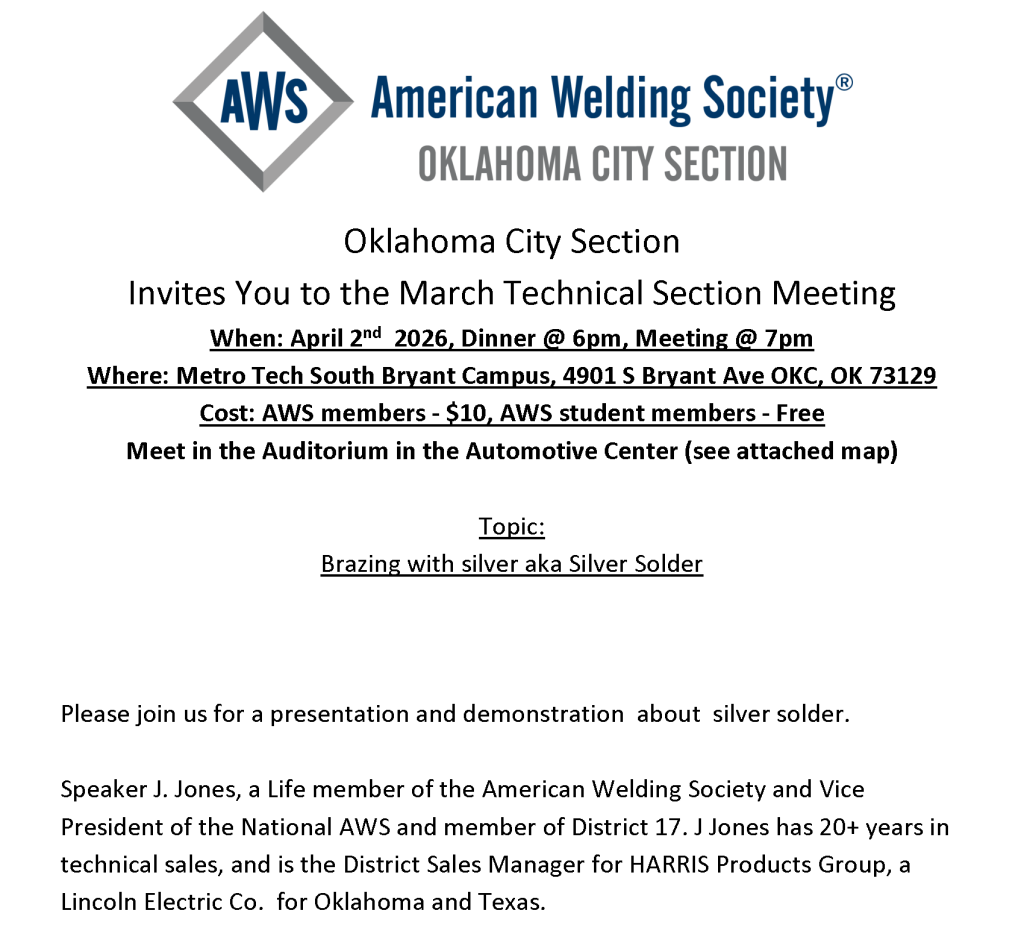 By zmederosMarch 5, 2026Category: Uncategorized Please join us for a look into silver solder and brazing technology presented by AWS Vice President, J Jones. of the Harris Group, a Lincoln Co.The meeting will take place on Thursday, April 2 at 6PM Central. Please see the attached for a map of the campus and were we will met. ➡️RSVP: Please RSVP to cary.reeves@gasandsupply.com📍Location: 4901 S. Bryant Ave, OKC 73129