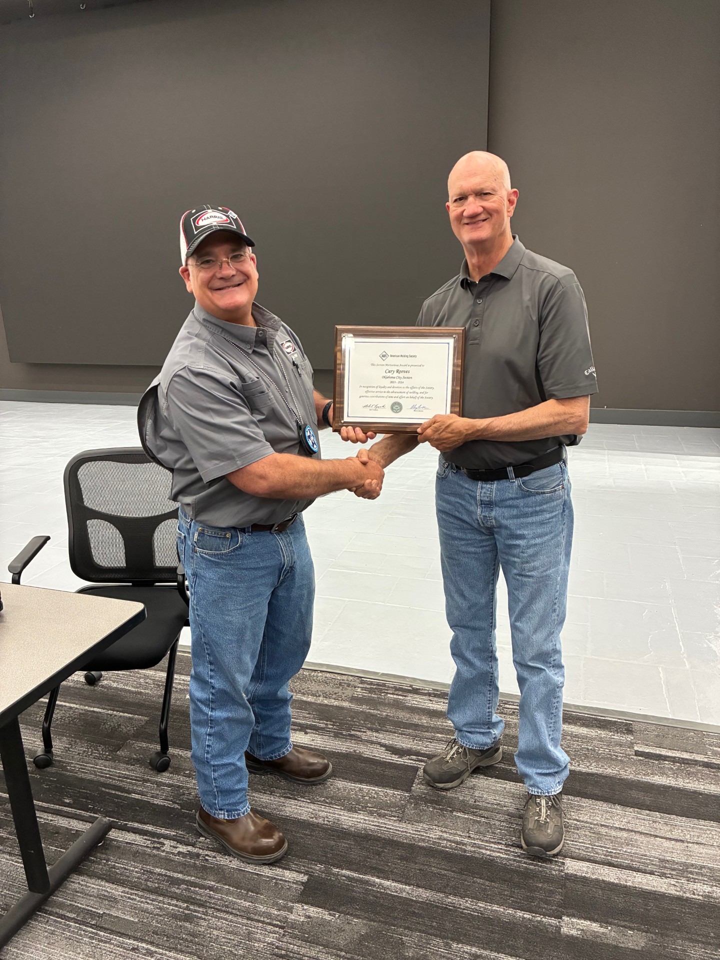 Jay Jones on left presenting Cary Reeves the Meritorious Award for the OKC Section