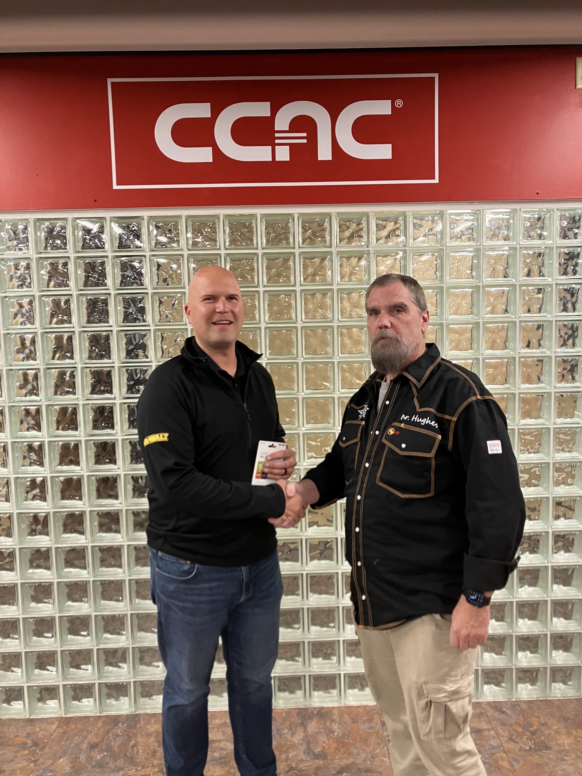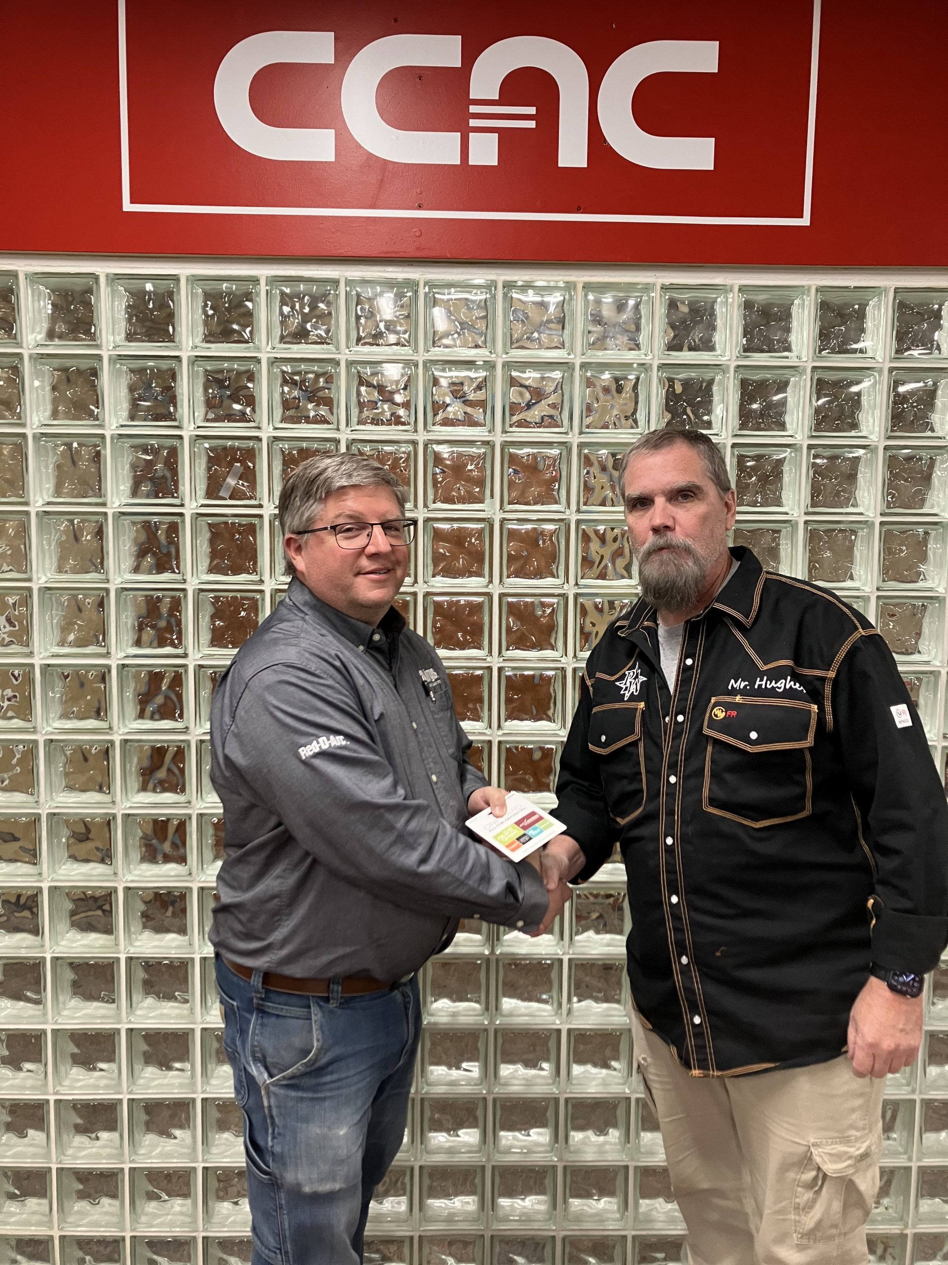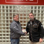 Justin Verbosky Stanley Black & Decker receiving gift card from Huck Hughes