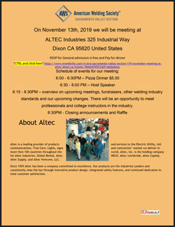 Come join us for an informational event; learn about one of our local Businesses that service the servicing community; learn about opportunities in industrial community; and how the AWS Sacramento Section is working to bring opportunities for education for employment and knowledge to industry.