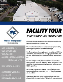 We will be touring Jones and Lockhart Fabrication in St. Louis Missouri on Wednesday December 8th at 530 PM. They are located at 3401 Morganford Rd St. Louis Mo. 63116. Established in 1946, we are a full service industrial fabrication and welding company based in St. Louis, MO. We are dedicated to meet and exceed customer’s requirements by producing quality products on time and on budget. We offer complete engineering/design services utilizing SolidWorks 3D modeling, total fabrication and welding, repair/rebuilding and site work. We are professional contractors with AWS Certified Welders. Our main facility is over 50,000 square feet and 4.5 acres with a lifting capacity of 50,000 lbs. We have a second facility with 25,000 square feet thus putting our combined fabrication facilities at over 75,000 square feet. We also offer in house stress relieving. Our gas fired, non-atmosphere controlled oven measures 15’ x 25’ x 8’ deep. Temperature rated to 1600 F. The tours are open to any AWS members, if you wish to attend you will need to wear long pants, closed toe shoes, and bring your own pair of safety glasses. We are limiting the number of participants to 25 for the event so please RSVP to Becky McDonald before Wednesday December 1st if you wish to attend. Becky can be reached at rmcdonald@clsmith.com or (314)312-6155 |