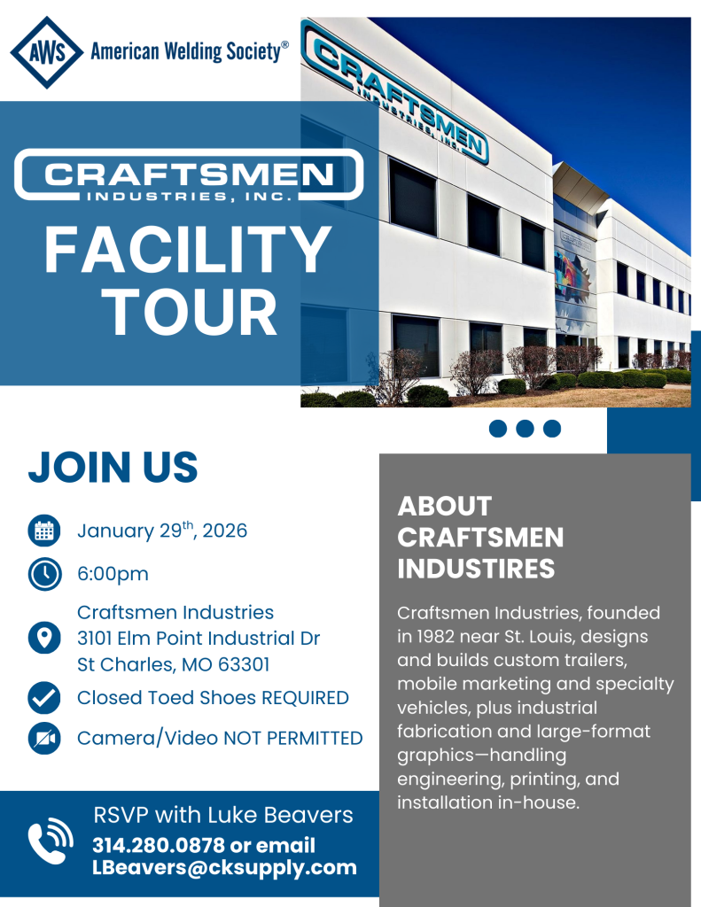 Come join us in St. Charles, MO! Craftsmen Industries will be hosting our Section’s Event on January 29th at 6:00 PM CST.