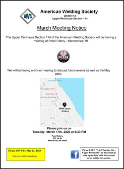The AWS Upper Peninsula Section will be meeting at the Pearl Eatery in Menominee, MI on March 17th for a discussion of future events, as well as the May party.