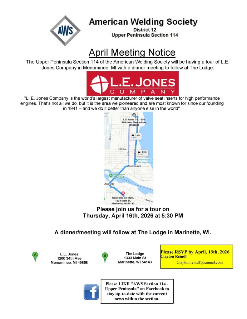 The Upper Peninsula Section 114 of the American Welding Society will be having a tour of L.E. Jones Company with a dinner meeting to follow at The Lodge on Thursday, April 16 at 5:30PM.