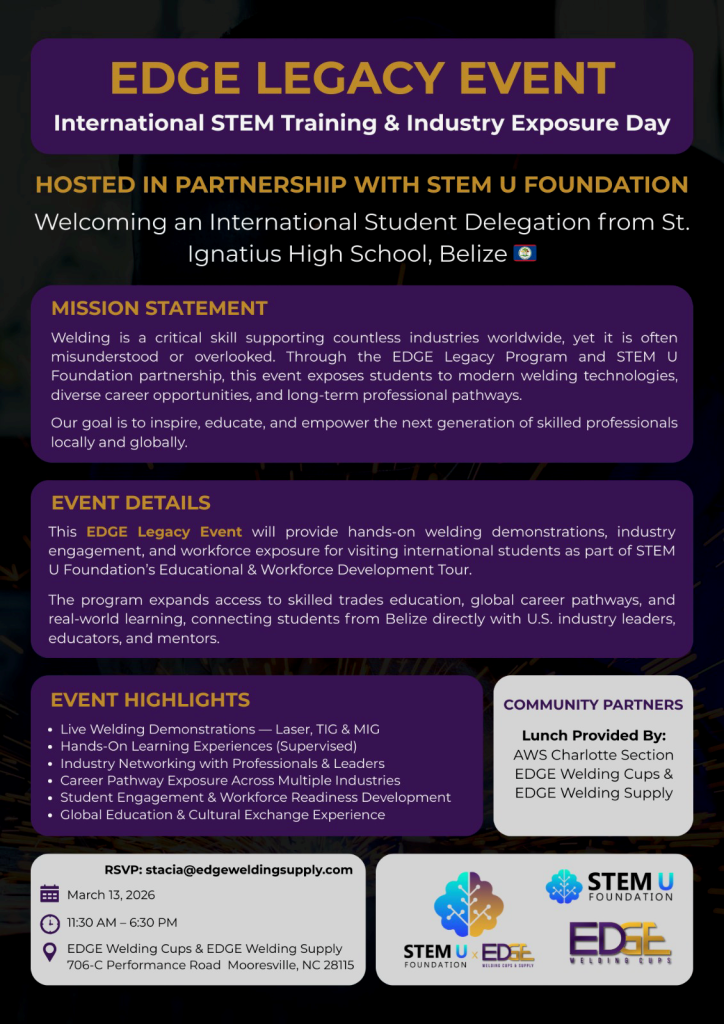 Join us, EDGE Welding Supply and the STEM U Foundation to provide hands-on welding demonstrations, industry engagement, and workforce exposure for international student visiting from St. Ignatius High School in Belize.