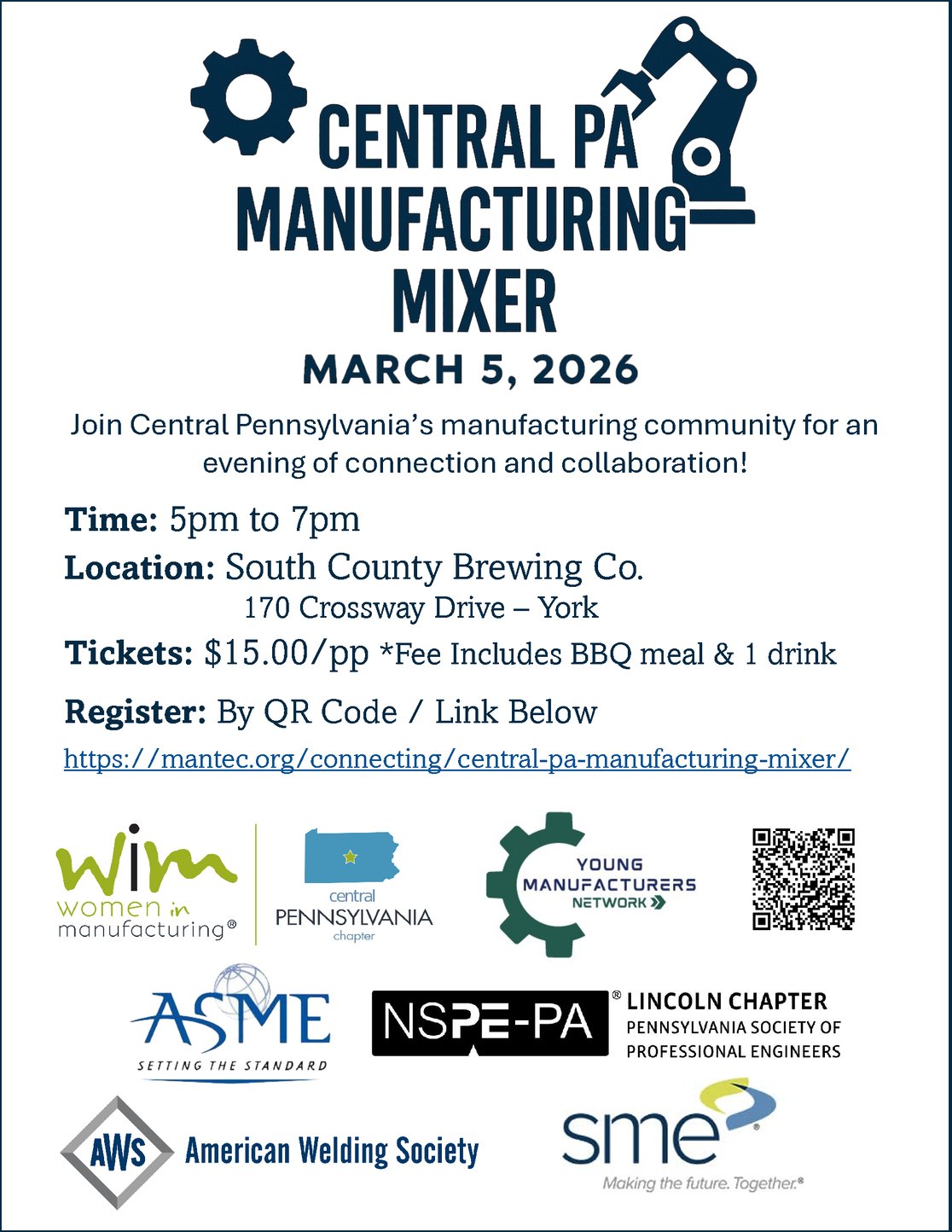 Join Central Pennsylvania’s manufacturing community for an evening of connection, collaboration, and conversation. This Manufacturing Mixer brings together professionals from across manufacturing, engineering, welding, and related industries for casual networking in a relaxed setting. ➡️RSVP: Please register here, each ticket costs $15 per person. Registration includes BBQ & one beverage per guest. 📍Location: South County Brewing Co., 170 Crossway Drive, York, PA |